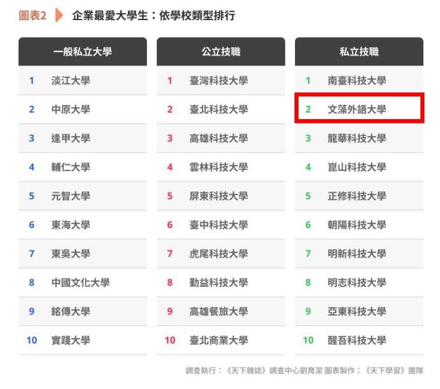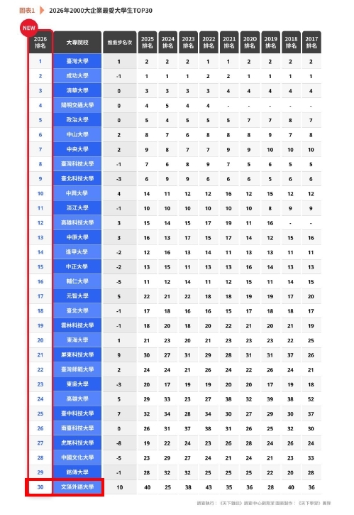 2026企業最愛大學生排行榜 文藻外大榮登全國前30強